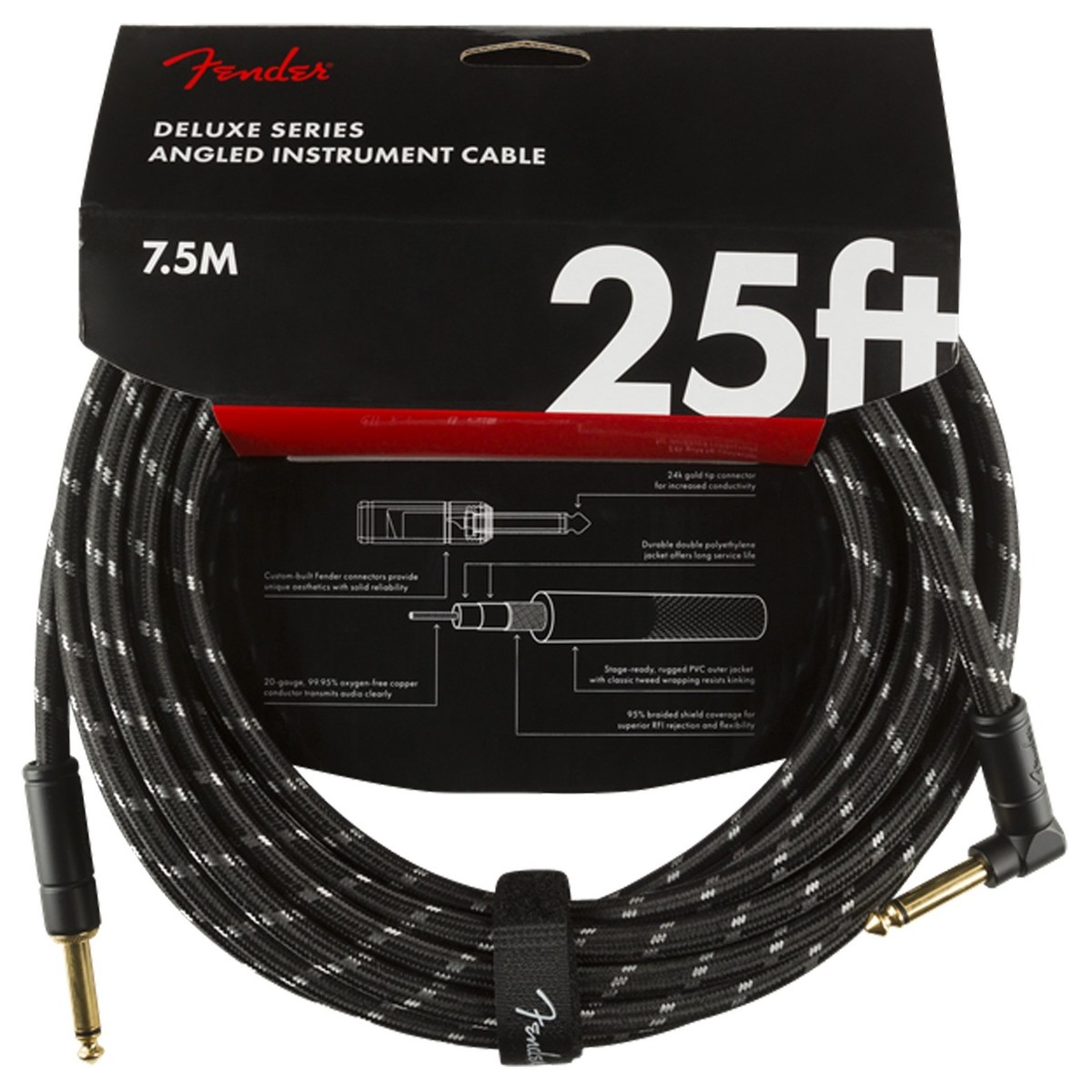 Fender Deluxe 25ft Straight/Angle Instrument Cable, Black Tweed