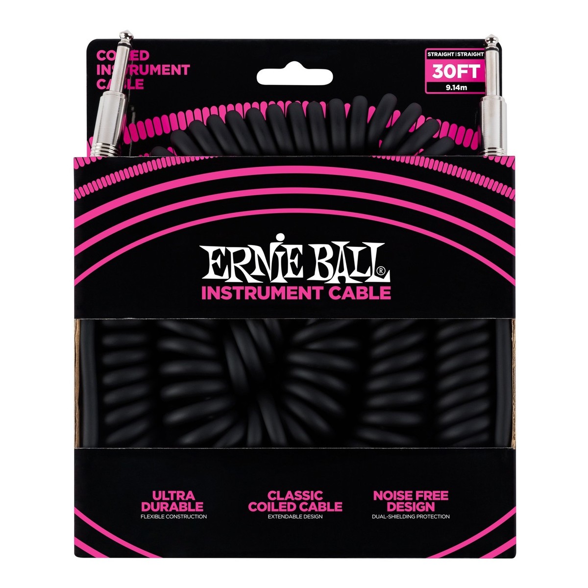 Ernie Ball P06044 30ft Straight-Straight Coiled Cable, Black