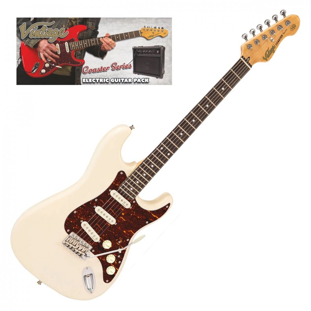LA Select Legacy Electric Guitar Vintage White, 15W Guitar Amp & Accessory Pack