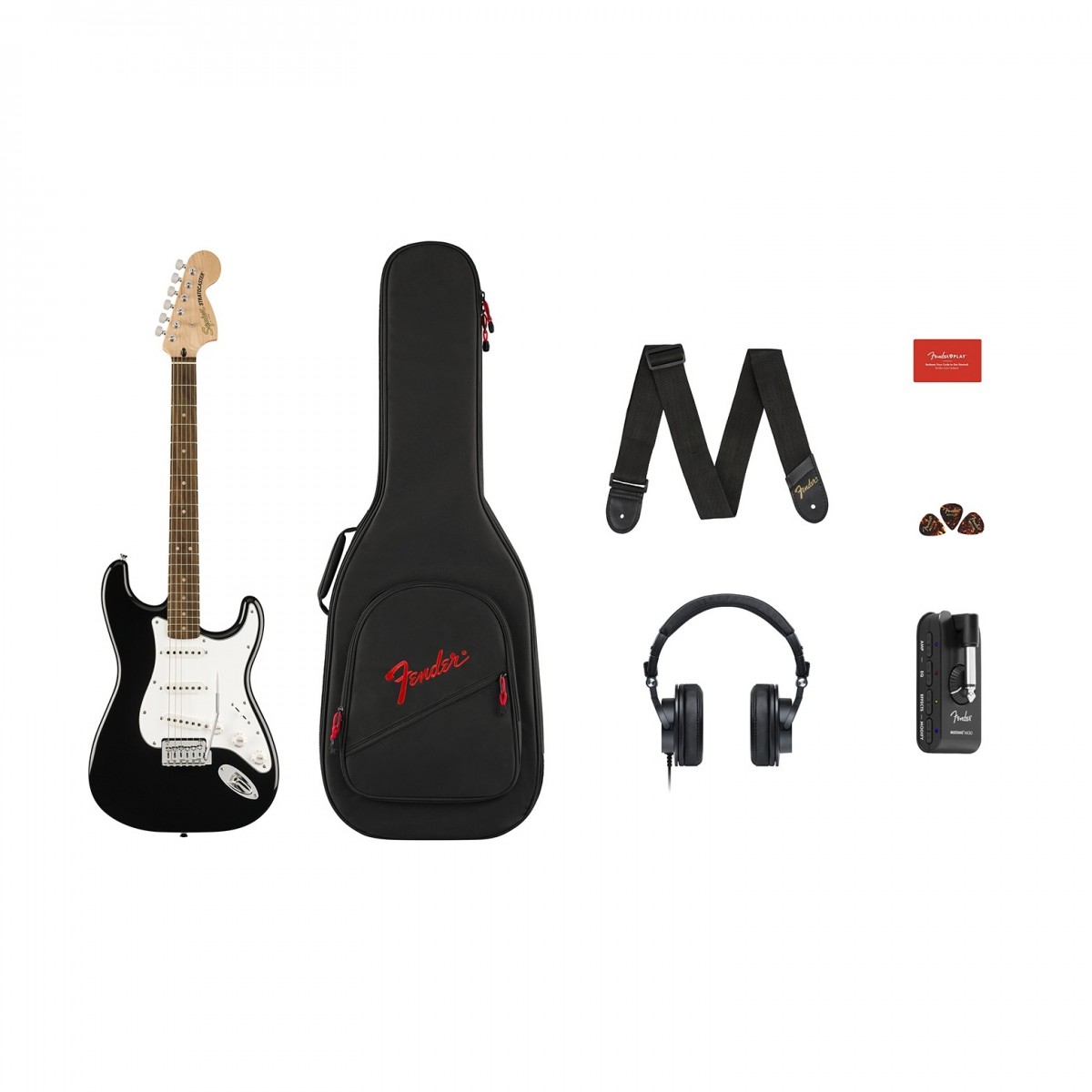 Squier Affinity Series Stratocaster Mustang Micro Pack, Black, with Gig Bag and HD9 Headphones