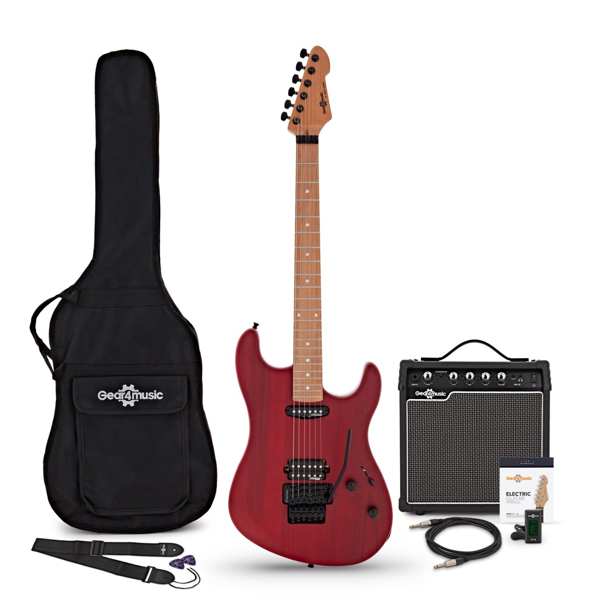 LA Select Modern Electric Guitar Transparent Ruby Red, 15W Guitar Amp & Accessory Pack